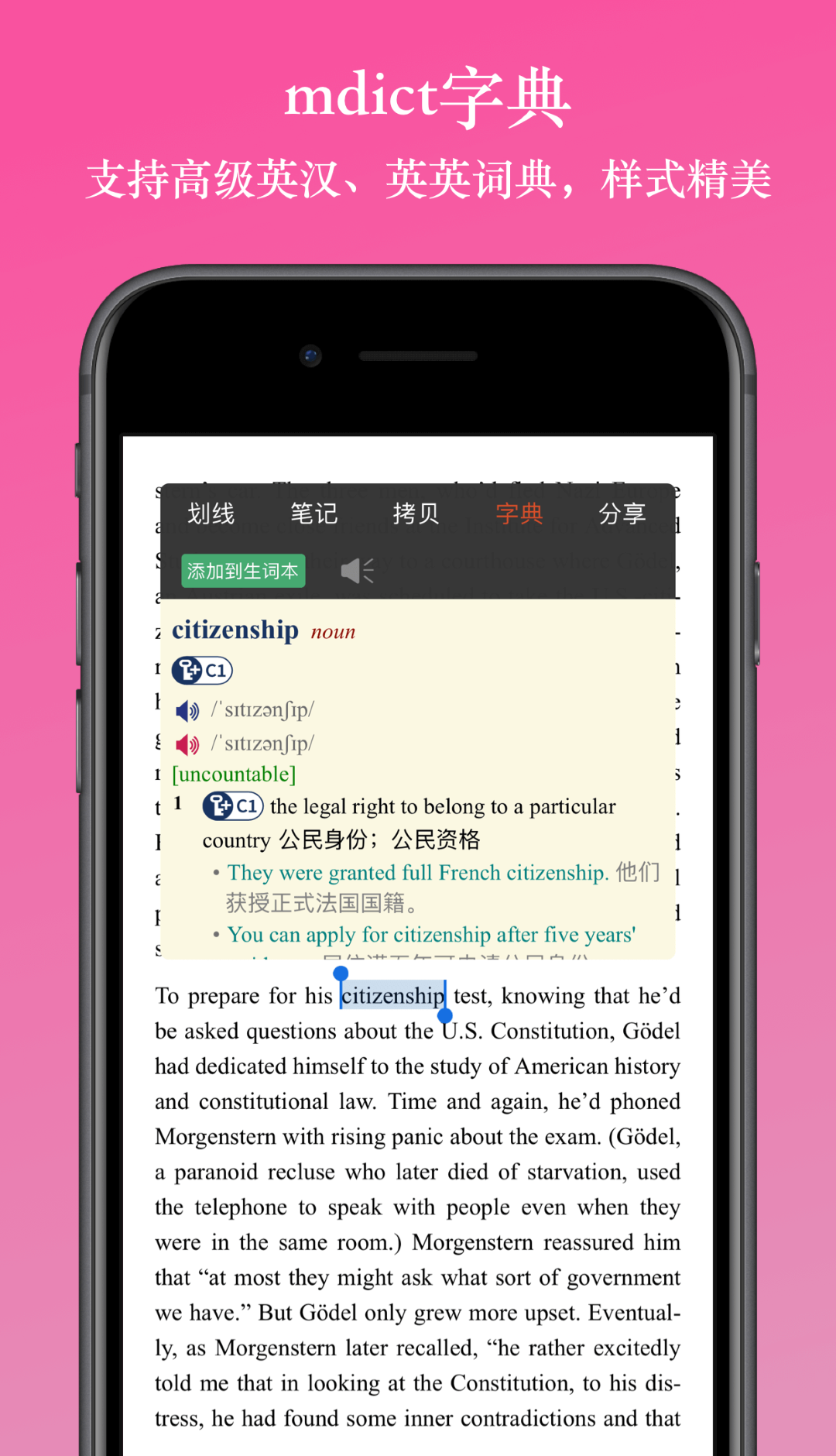 【英阅阅读器】是为学英语等外语(英、法、俄等)而开发的利器, 在蒙哥英语原版阅读器功能基础上,集OPDS图书源、英语单词分级透析、单击查词、mdict词典、背单词、阅读笔记等众多功能于一体,为您的英语学习保驾护航!