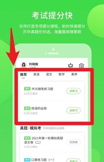 4、在“考试提分”栏目中浏览推荐练习题,点击右侧“去练习”即可在线完成专项训练与真题模拟。