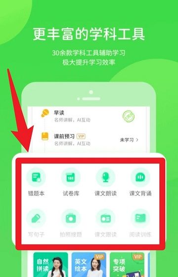5、切换至学科工具区,可使用错题本、试卷库、课文朗读、拍照搜题等功能辅助学习提升效率。