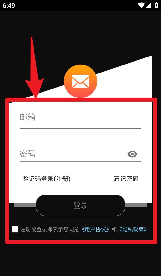 1、打开 App 后进入登录页面,输入邮箱与密码完成登录,亦可选择验证码注册新账号。