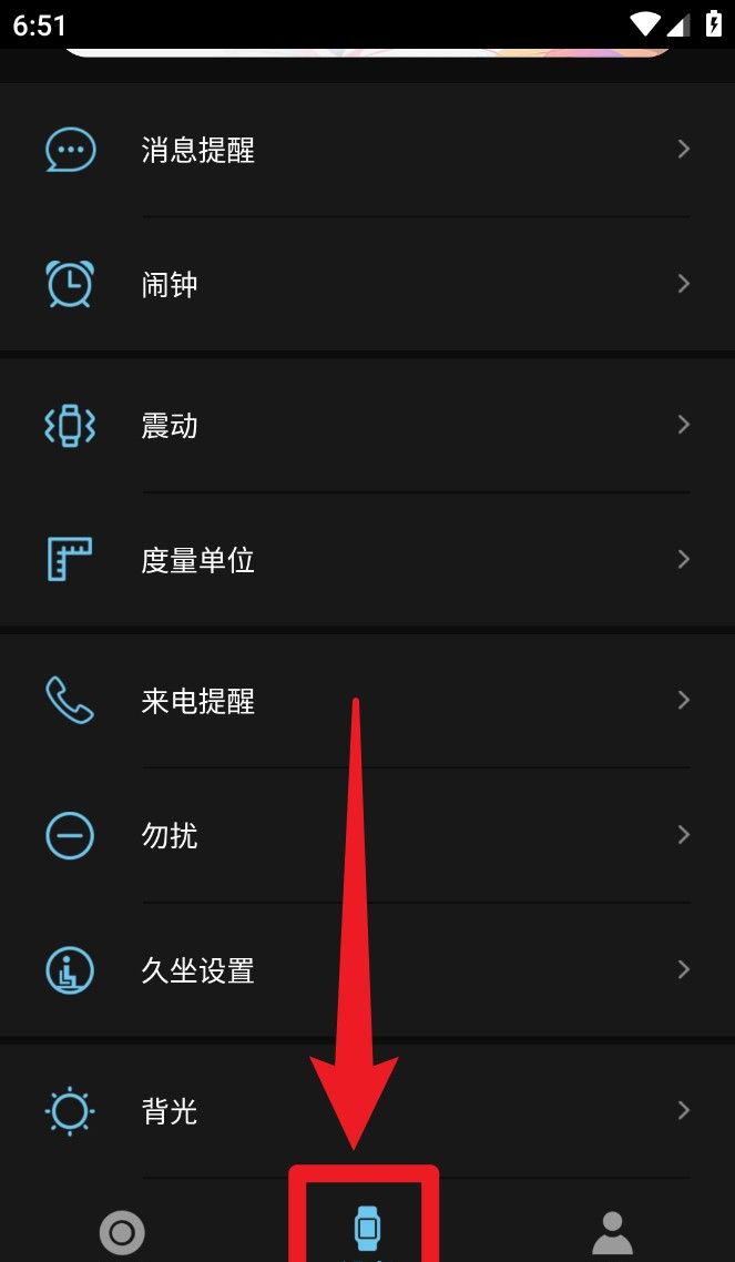 4、切换至「设备」页面,可设置手表提醒、震动、来电通知、久坐提醒等穿戴设备功能。