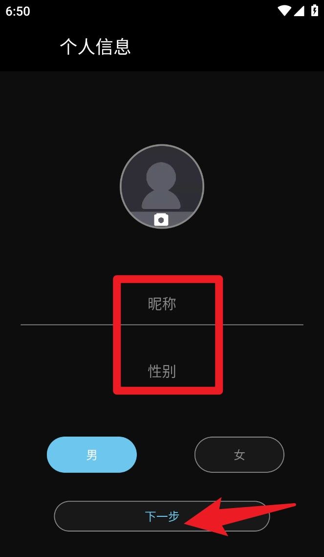 2、登录成功后进入个人信息填写页,输入昵称并选择性别,再点击「下一步」进入主界面。