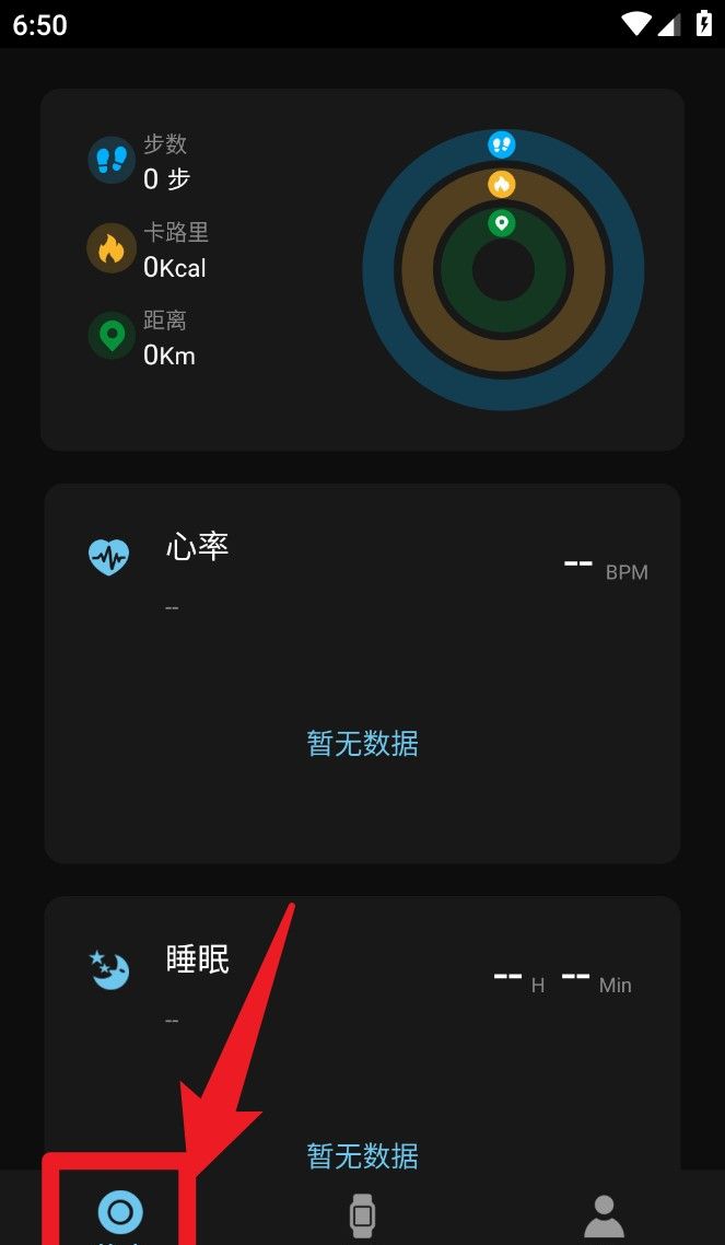 3、在底部导航栏点击「状态」按钮,可查看步数、心率、睡眠等健康监测数据概览。