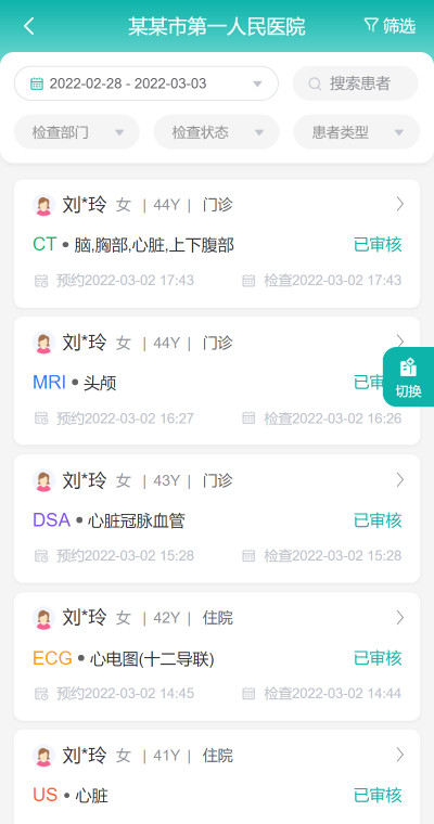 3、在医院患者列表,筛选检查时间部门等,快速定位患者,查看影像及报告状态。