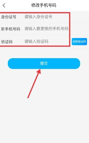 4、在修改页,填写身份证号、新手机号、验证码后点【提交】,完成号码修改。