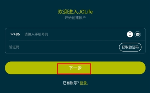 2、在登录页面输入手机号码和验证码,点击【下一步】按钮。