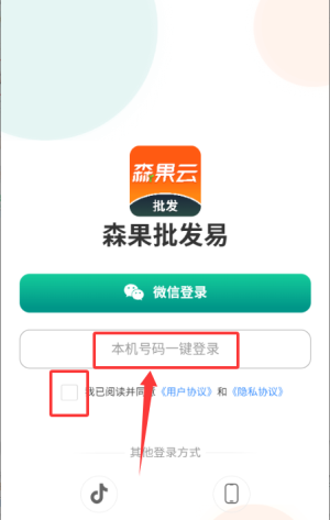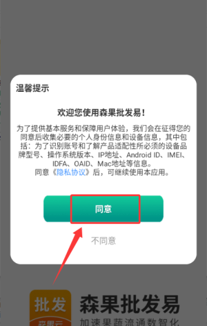 1、在森果批发易,点击“同意”提示进入登录选择界面。