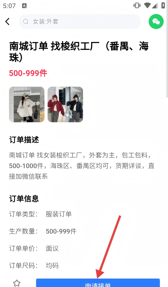 4、进入订单详情页面后,找到底部蓝色的“申请订单受理”按钮,点击即可完成订单受理申请操作。