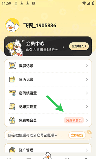 1、在飞鸭AI记账app个人登录界面界面点击【免费领会员】。
