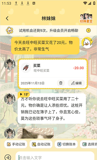 2、然后就可以与它进行聊天了,聊天时会自动识别需要记账的相关信息。
