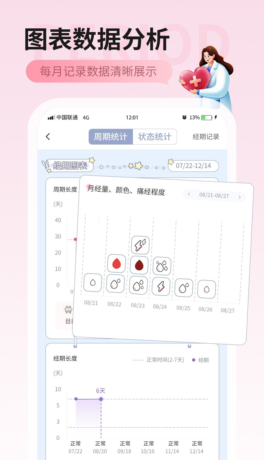 2、丰富的统计数据:提供各种统计图表,帮助用户直观了解自己的月经和身体状况。