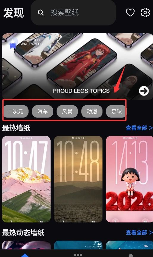 2、发现界面包括动漫、汽车、风景、动漫、足球等内容类别。