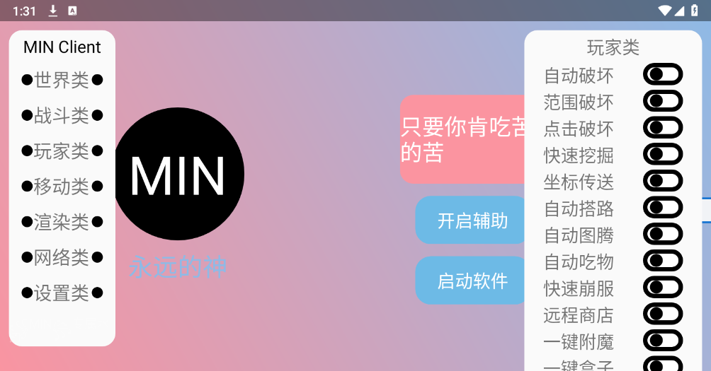2、点击开启辅助,打开悬浮窗,再启动末影人盒子(公益版)。