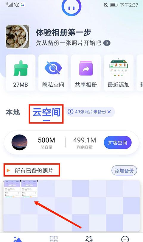 4、在云空间部分,您可以看到“所有备份的照片”。
