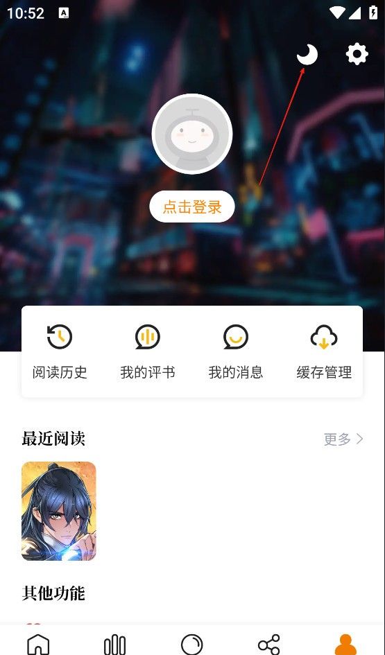 3、在阅读过程中,点击左下角的月亮也可以切换到夜间模式。