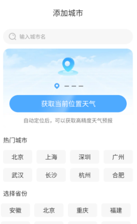 2、进入添加城市界面,可以选择热门城市或直接定位。