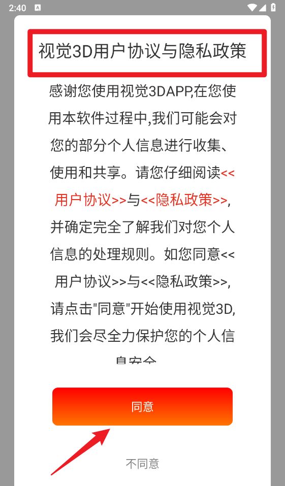 1、首次打开应用时,阅读并同意用户协议与隐私政策,点击同意进入。