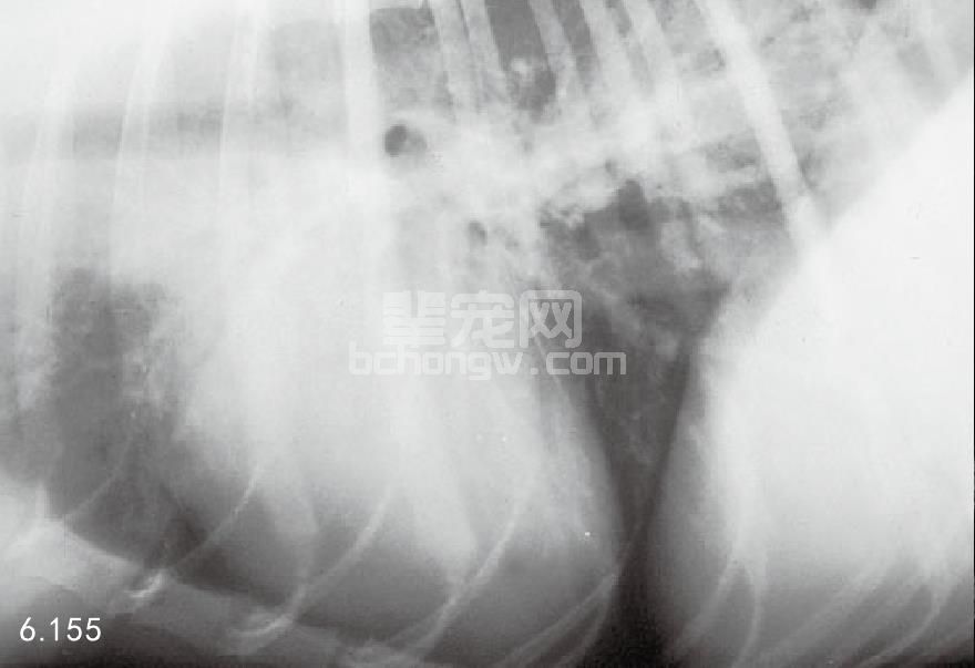 病理生理学 随着心丝虫的增多,它们可能迁移到右心房并最终进入后腔静脉(图6.154)。大量的虫子可 能会阻止静脉血返回右心房,引起急性的危及生命的并发症(后腔静脉综合征)。