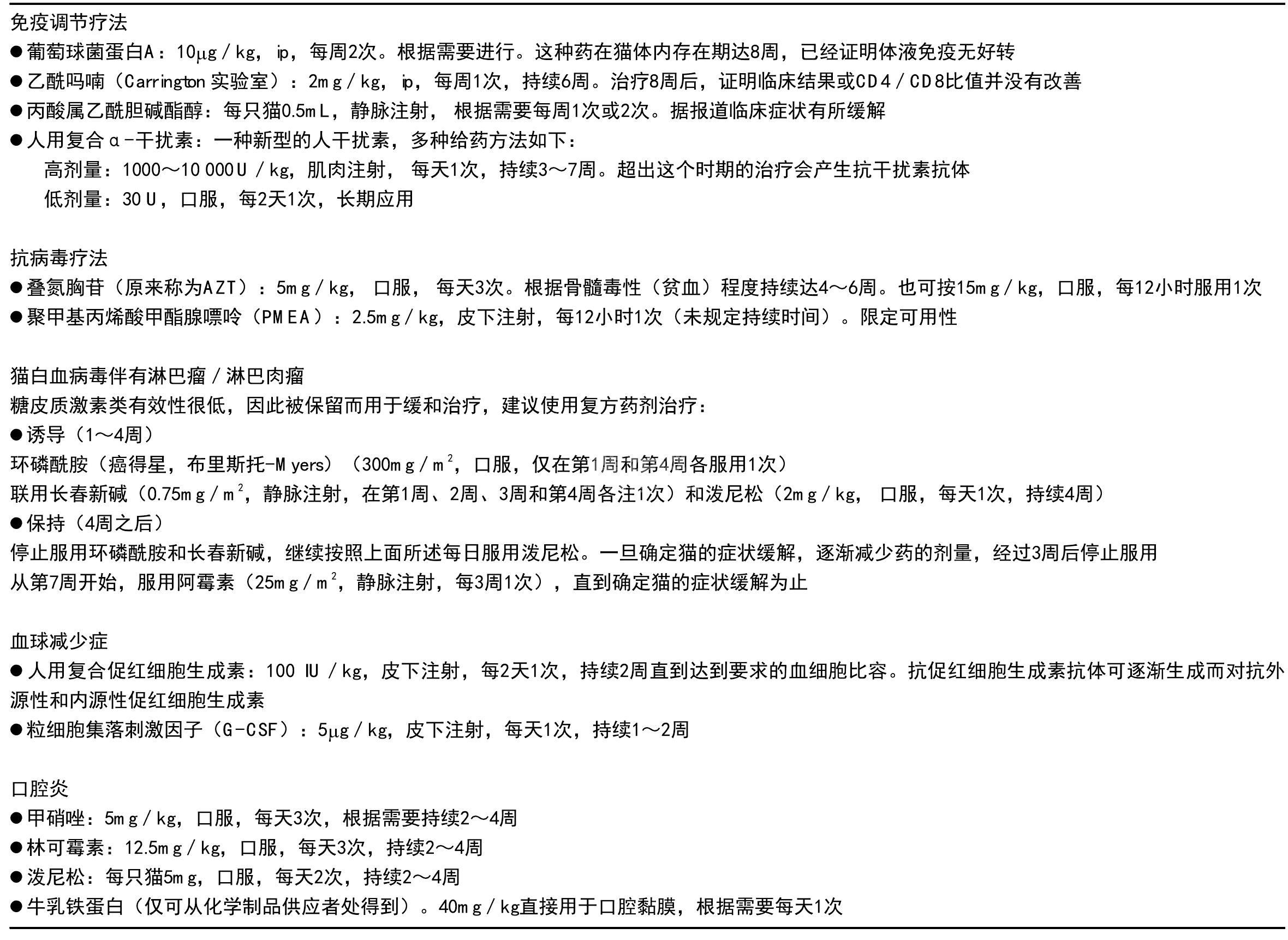 治疗/预后 根据FeLV感染猫的临床症状来确定相应的治疗方法。已经尝试过各种免疫调节剂和抗逆转录 病毒的治疗手段。 免疫调节剂和抗逆转录病毒治疗结果存在较大变数,但该领域研究从未停止。正如在FeLV感 染的猫中,AZT(叠氮胸苷)、PMEA(聚甲基丙烯酸甲酯)和重组人α-干扰素已经试图用来治疗FeLV 感染的 猫。表1.5中列出了这些产品的推荐给药方案。FeLV感染通常导致实体瘤的出现,最常见的为淋巴瘤。有几种化 疗组和已经被推荐作为肿瘤的治疗手段。单一使用皮质激素作为治疗由FeLV诱发肿瘤的方法,其效果不明显。 最有效的治疗组合应该包括环磷酰胺和配合长春新碱并配伍泼尼松(表1.5)。患有骨髓功能抑制疾病的猫预后 不良,同时最好输全血以缓解贫血。但是这种治疗却受到医疗费用和多种血型输送产生后果的限制。