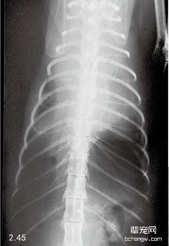 图2.45 与图2.44同只猫的背腹侧胸腔X线片。