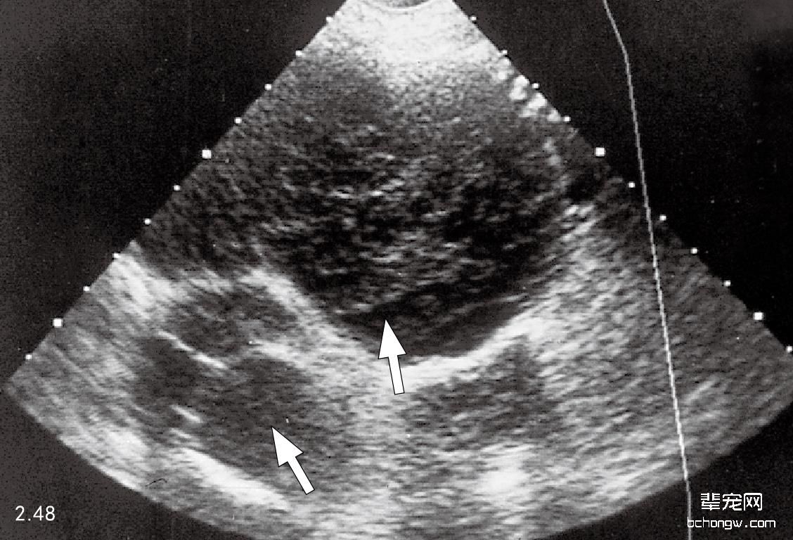 图2.48 患有颅侧胸腔纵隔淋巴瘤的6岁大丹犬的胸部超声波图:小块次回 声肿块(箭头所示)。