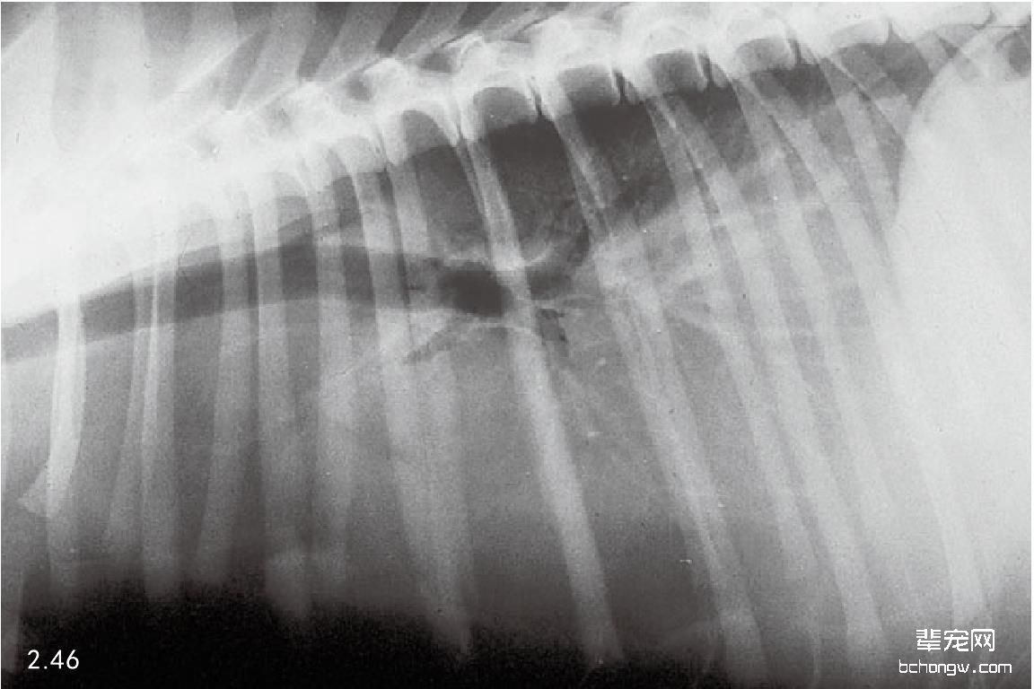 图2.46 患有胸腔壁肿瘤的一只2岁牧羊犬的侧面胸腔X线片。