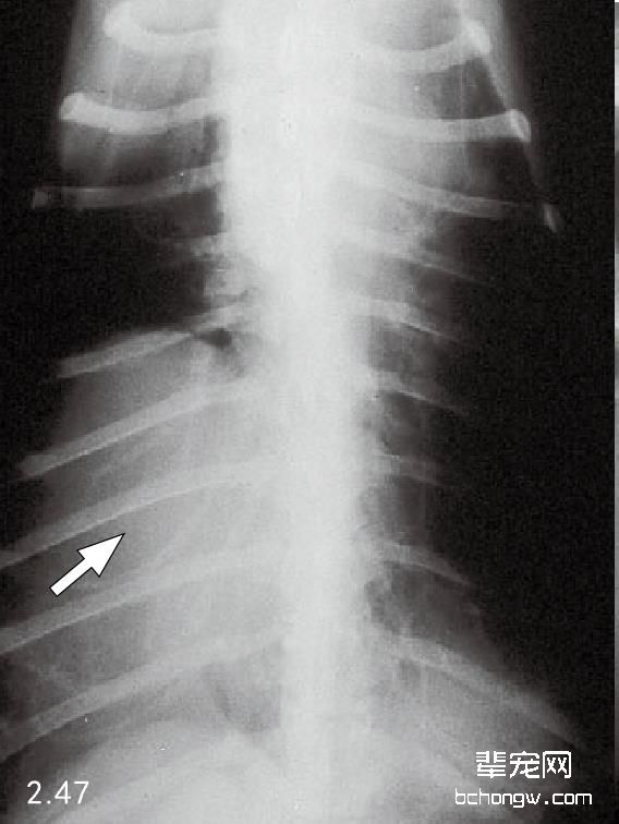 图2.47 与图2.46同只犬的背腹侧胸腔X线片(箭头所示)。