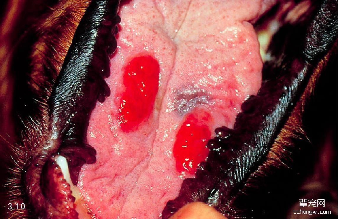 图3.10 2岁金毛猎犬患芽生菌病后的舌肉芽肿。该犬同时还有体温升高和全身淋巴腺病。