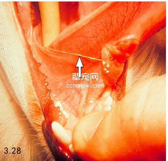 图3.28 缠在猫舌根部的线形异物(箭头所指)。