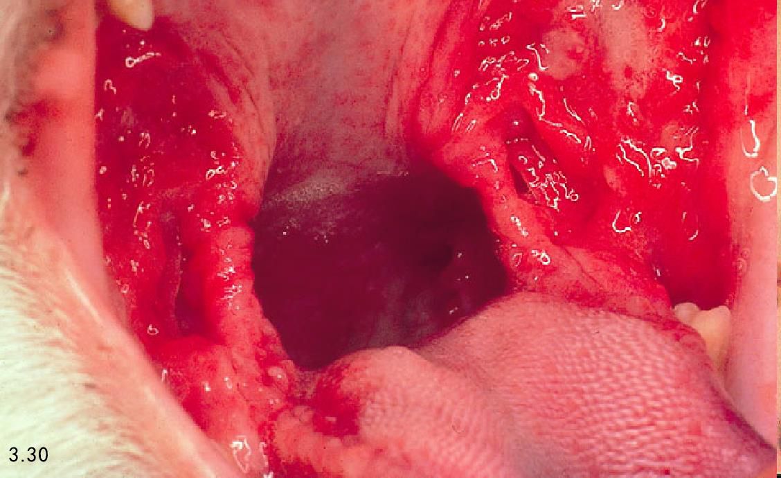 图3.30 3岁暹罗猫喉头前部严重的增生性浆细胞-淋巴细胞性口炎。将该猫的牙齿全部拔除后症状有所改善。