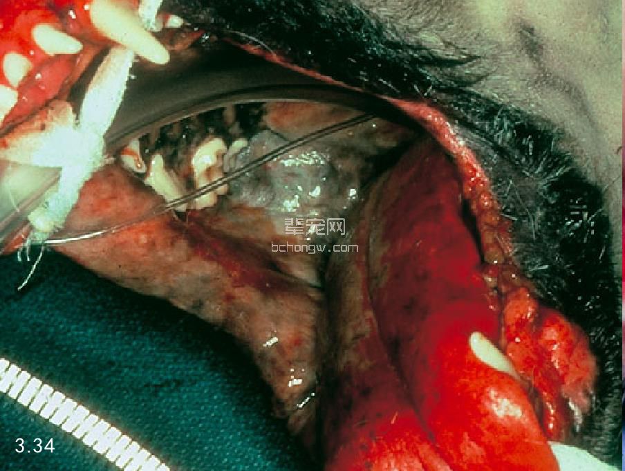 图3.33和图3.34 照片说明这两只犬都患有明显的咽炎。图3.33为一只可卡猎犬,此犬还伴有口炎;而图3.34则是有人恶作剧,让一只德国牧羊犬食入 碱液后的损伤情况。