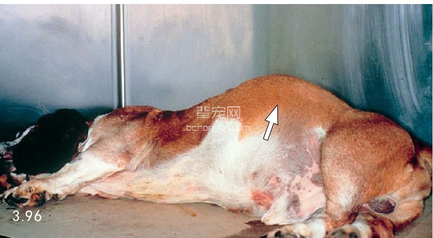 图3.96 胃扩张-扭转(GDV)可以突然发生而没有任何 征兆。人们发现这只巴赛特猎犬死在自己的笼子里,而它 在几个小时前进行跛行检查时还没有任何异常。注意明显 膨胀的胃(箭头所指)。