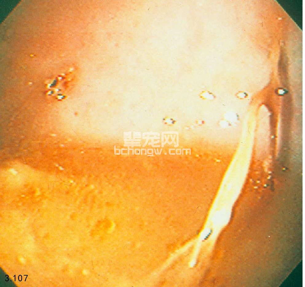 图3.108 沙皮犬患艾迪生病出现弥漫性胃糜烂与出血。在此种病中这类出血性胃损伤是常见的。