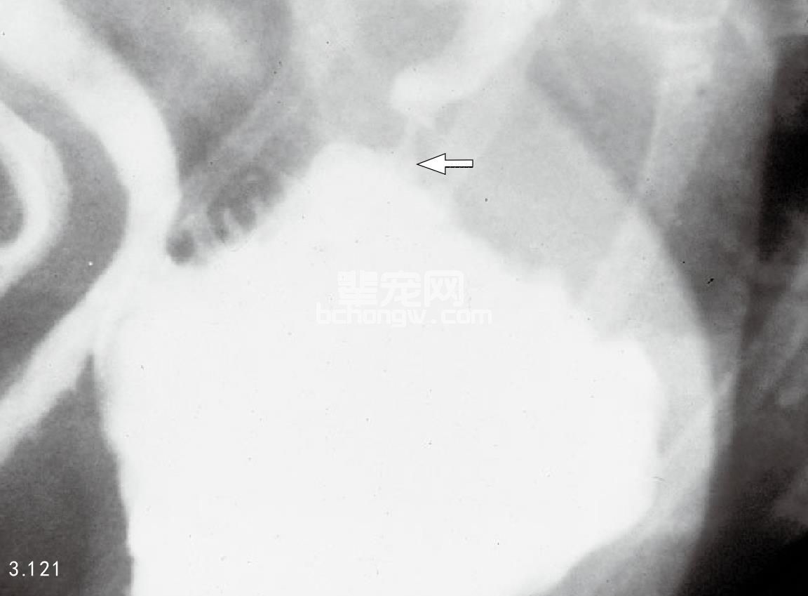 图3.121 图3.119中提到的犬造影X线片:幽门窦膨胀、幽门道狭窄,形成了典型的喙状突或乳头状影像(箭头所指)。