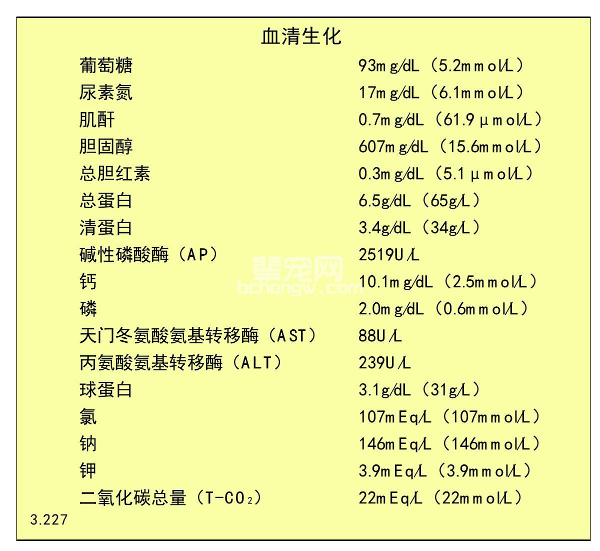 诊断 血清AP活性增加是常见的测试结果。血清AP活性增加主要是由于肝脏对糖皮质激素反应产生的AP同 工酶。血清AP活性增强与肝外胆管梗阻和胆汁滞留时,与酶活性增强相似。相反,大多数犬糖皮质激素性肝病 血清胆红素浓度保持正常。同样当ALT可能表现轻微到中度增加,AST常接近正常(图3.227)。血清中胆汁酸浓 度可能有少量增加(通常禁食状态时低于25mmol/L)。