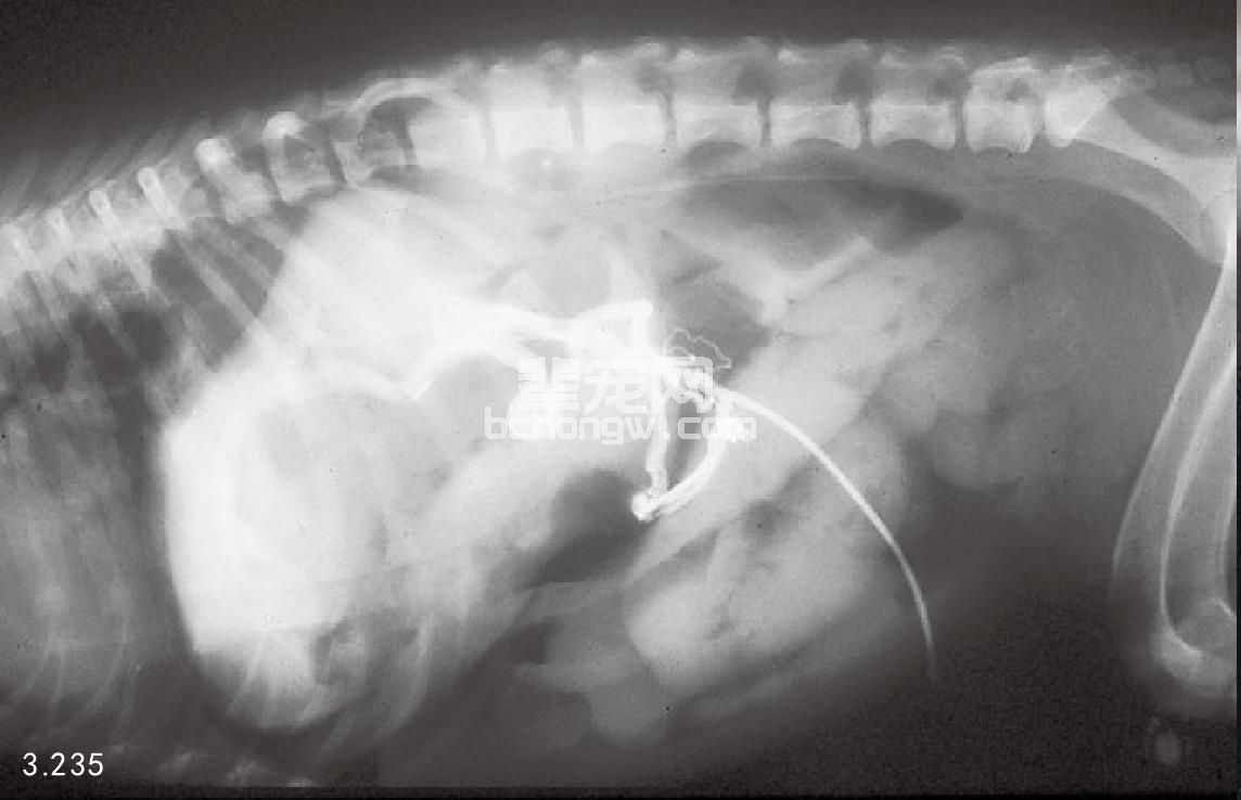 图3.235 2岁拉萨犬肠系膜静脉门静脉造影确诊的静脉分流。