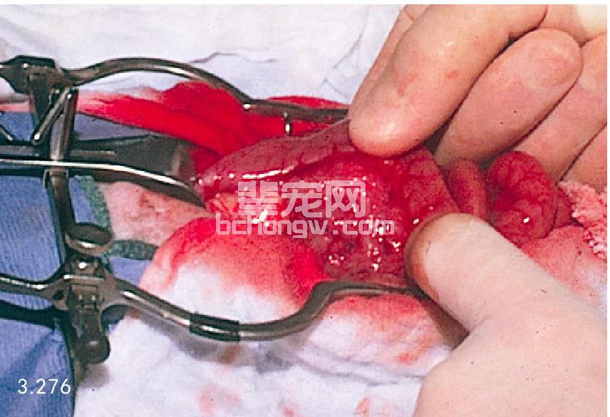 图3.276 图3.275中的病猫剖腹手术可见胰腺明显纤维化和萎缩。