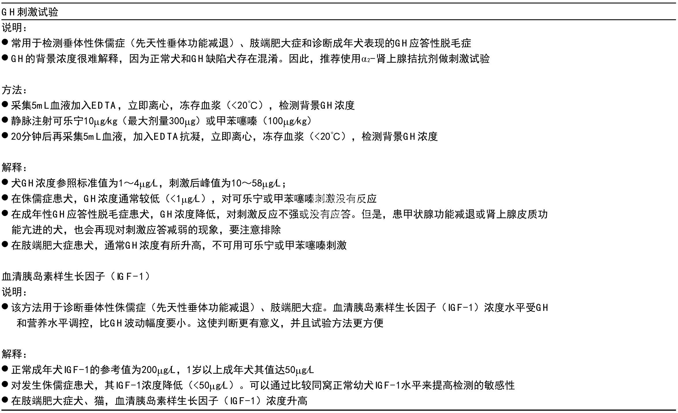 治疗 犬GH还没有应用于临床治疗。但是,牛、猪、人GH已经用于临床治疗。通常,在垂体功能减退诊 断太晚,以致影响生长非常明显,患畜表现永久性侏儒症。在有些病例,使用GH(0.1IU/kg,皮下注射,每周3 次,连续4~6周),可以促进被毛再生。但是使用外源性可以使动物产生抗体,而影响GH的进一步作用。GH很 贵,并且重复使用可以诱发糖尿病。