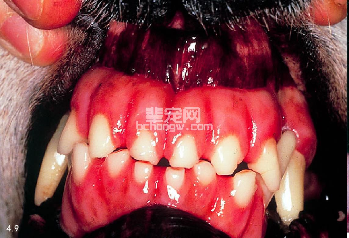 图4.9 患肢端肥大症的12岁拉布拉多猎犬,门牙分开,牙齿间隙增大。