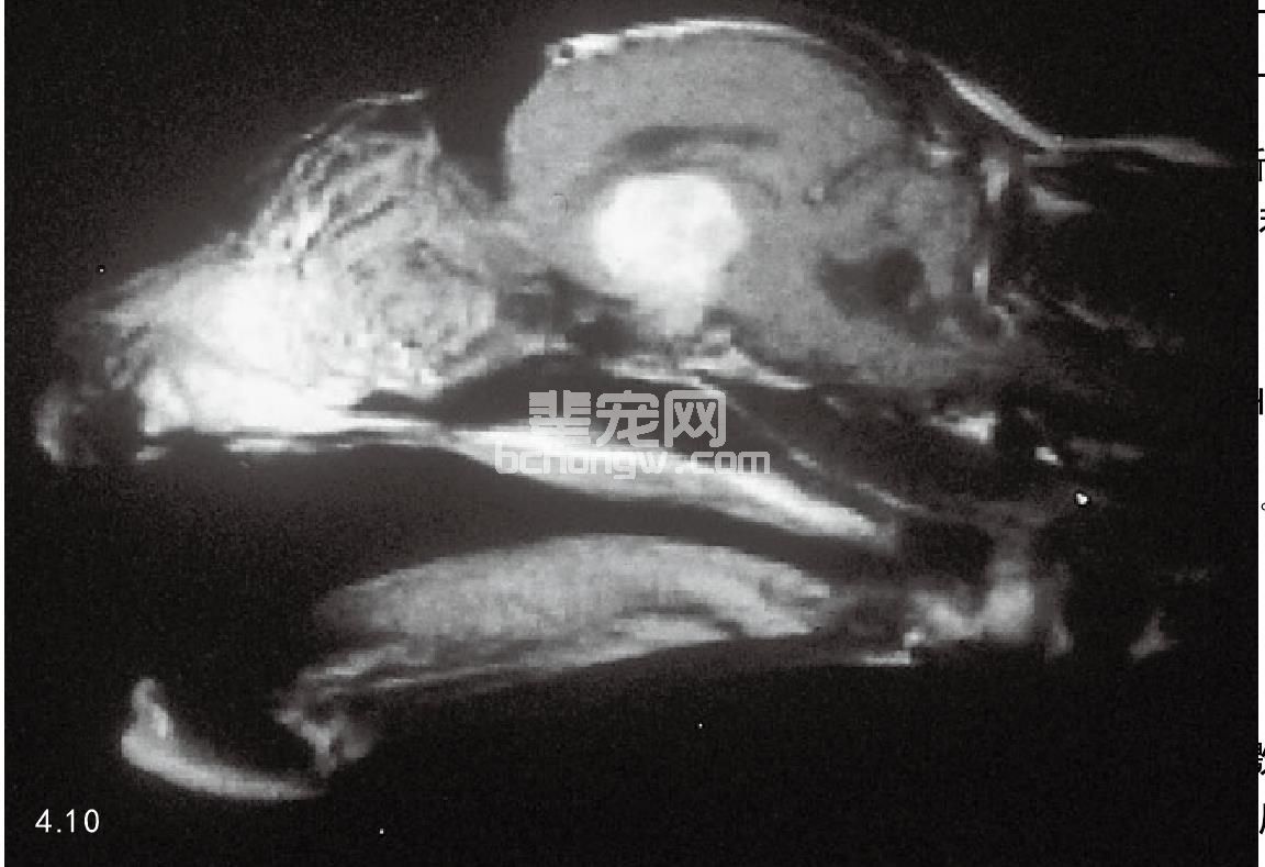 图4.10 肢端肥大症家养短毛患猫,脑部电磁波图像发现有垂体肿瘤。