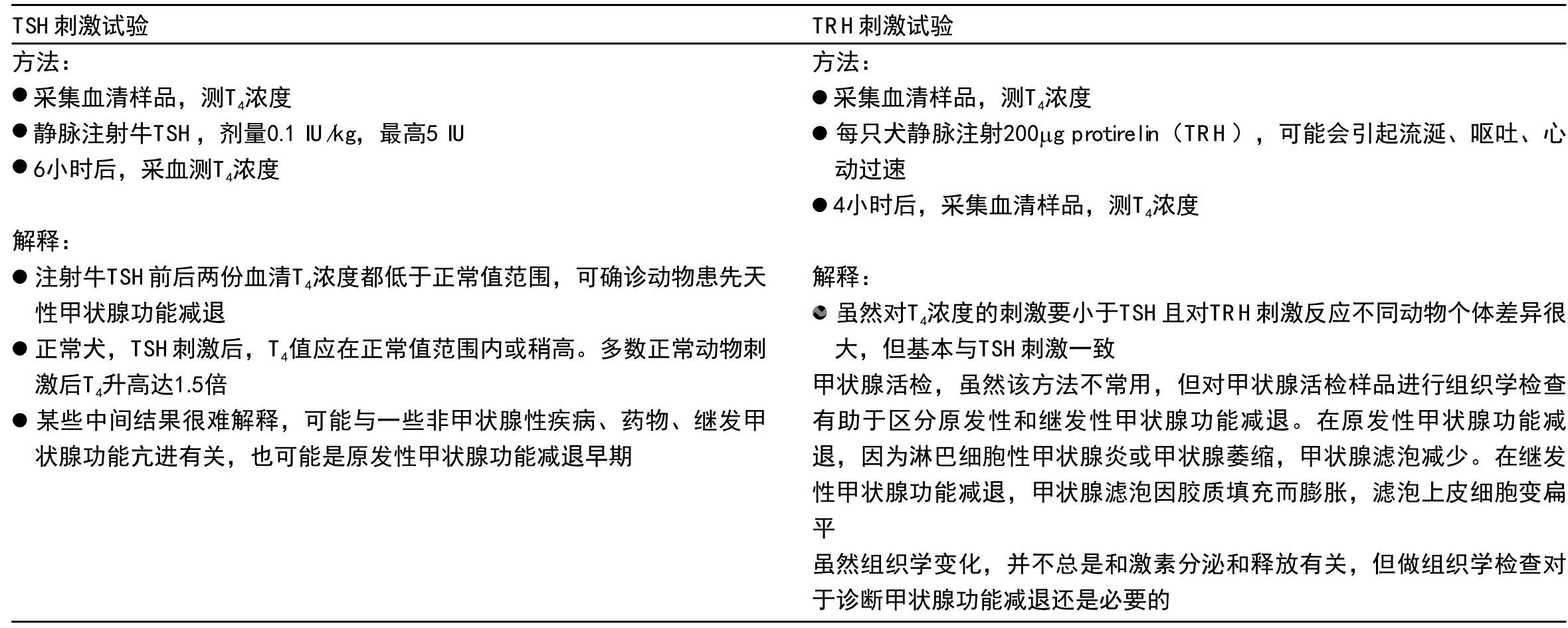 TSH刺激试验 服用外源性牛TSH是检测甲状腺功能减退患畜甲状腺分泌能力的有效方法。方法和标准见表 4.8。该方法的缺陷在于TSH注射价格昂贵,并且比较缺乏。