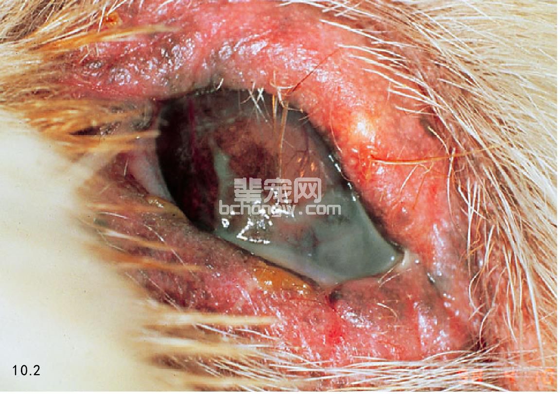 图10.2 犬干眼症时出现的色素性角膜炎、黏液性分泌物和睑缘区睑炎。