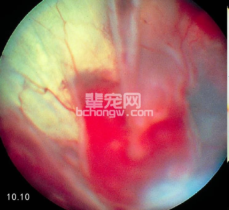 图10.10 猫弓形虫病时大片视网膜出血、脱落。