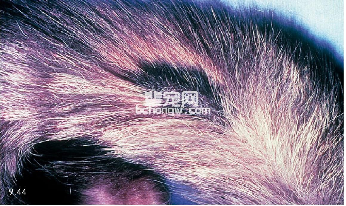 图9.44 猫的耳痒螨皮炎引发的脱毛与鳞屑。