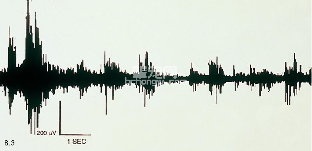 图8.3 肌强直猫:肌电图显示针刺后不同频率的消长性放电。