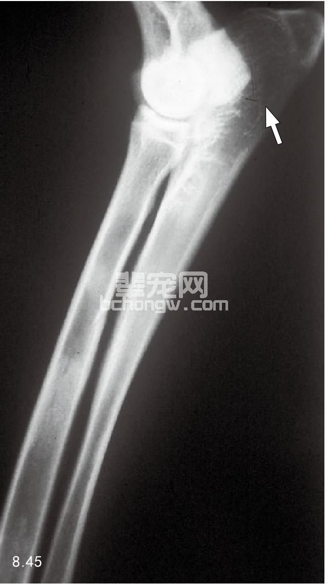 图8.45 滑液细胞肉瘤、肘部的软组织肿胀和桡骨头侵蚀(箭头所指)。滑液细胞肉瘤最常见于肘关节和膝关节处,肿瘤通常会到关节腔。该病以骨溶 解为主要症状,骨膜增殖较小,软组织矿化很少见。