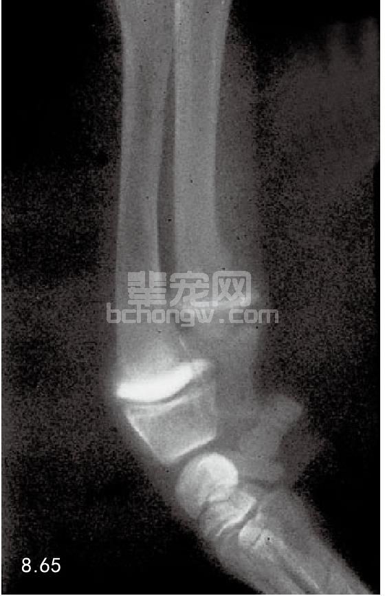 诊断 X线片显示高密度硬化的“锤条”,可以在未成熟犬的长骨的干骺端看到(图8.65)。多数发生在尺 骨和桡骨的远端。慢性维生素D、磷、铋中毒都会显示类似的影像学病变。