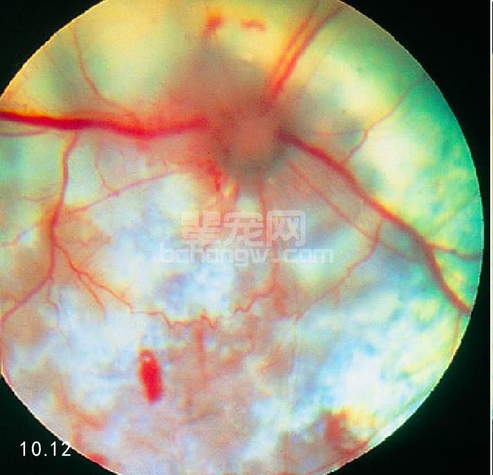 临床症状 犬和猫的临床症状包括肉芽肿性脉络膜视网膜炎(图10.12和图10.13)、视神经炎、视网膜脱落 及一些前葡萄膜炎。