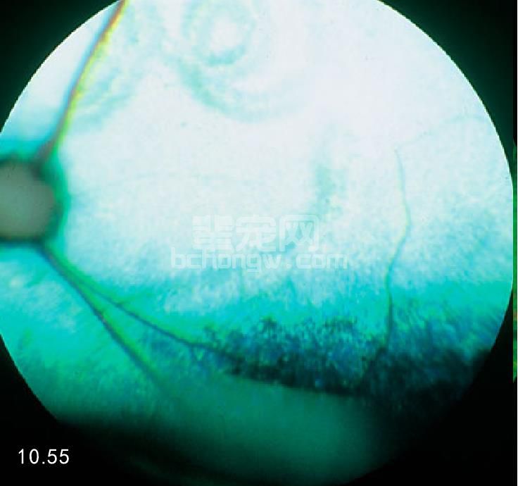 诊断 在给猫进行眼底检查时,如果在毯区的反射亢进部位出现脉络膜视网膜瘢痕,可以确诊,该病已处于 亚临床炎症过程 (图10.55)。