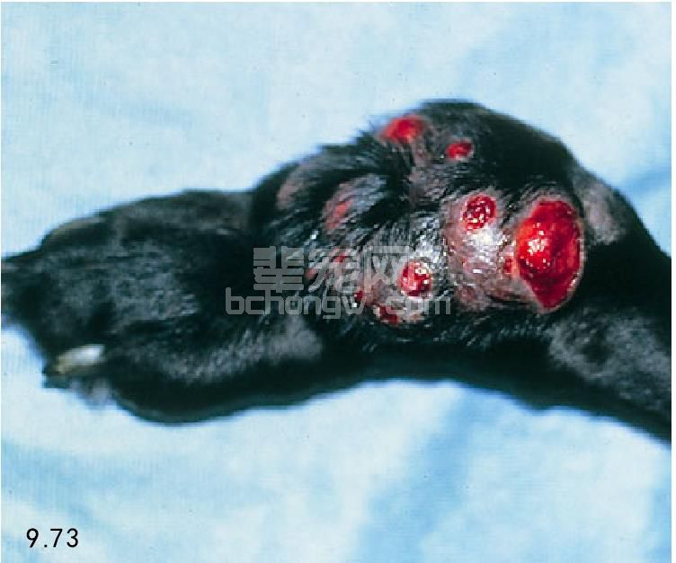 图9.73 肥大细胞瘤引起拉布拉多猎犬的腕部出现溃疡脱毛性结节。
